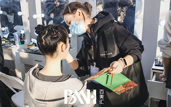 百美汇师生团队一进入后台便迅速进入工作状态。紧张有序的化妆间里,学员们在导师的悉心指导下,将课堂上习得的专业知识与反复打磨的实操技艺灵活运用:从底妆的细腻晕染到眼妆的层次塑造,从唇色的精准匹配到整体造型的风格统一,每一个细节都处理得恰到好处。